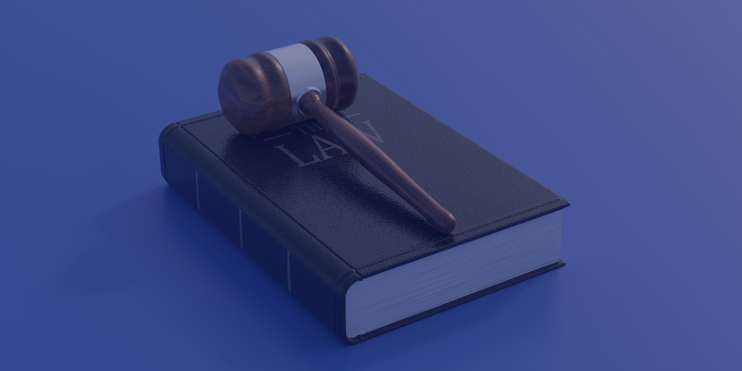 Attachment: Judge gavel and law book, blue background. 3d illustration